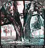 Trees: Live oaks shading the front lawn, black rubber trees, cypress trees, and an olive tree. (16 stereoviews)