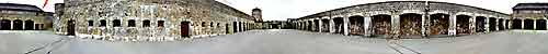 This 180 degree VR opens with a view of the surrounding countryside. The first building to be seen over the wall is the command headquarters, followed by the laundry, the kitchen, the jail/crematorium, and the sick quarters.