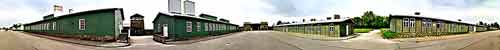 This VR opens looking toward the sarcophagus monument in the middle of the camp street. The large white building to the right is the museum (formerly the sick quarters). The smaller light-colored building to the right was the jail/crematorium. The first green building was the camp kitchen and the second green building was the camp laundry. The following stone structure is the entrance gate to the upper camp. The final three buildings are hut 1 (orderly room, shoemaker's workshop, and brothel), hut 6 (housing for kitchen personel), and hut 11 (housing for children and adolescents).