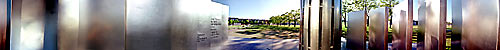The Ravensbrück Memorial in Amsterdam is a series of metal plates around a central column. An ominous sound track is played from the column and at night a display of flashing lights adds to the effect.