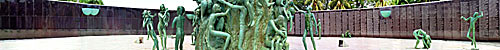 A Sculpture of Love and Anguish by Kenneth Treister rises from a reflecting pool at the Miami Beach Holocaust Memorial. To the right, the Arbor of History records the story of the Holocaust in words and photographs. (180 degree VR)