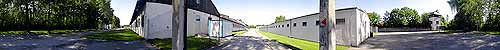 To the left is the rear of the Wirtschaftsgebäude, which contained the kitchen, laundry, storage rooms, and torture rooms. To the right is the Lagerarrest or Bunker. This functioned as the camp prison. Two guard towers and the Jourhaus (gatehouse) are also visible in this panorama. The long, low building just to the left of the Wirtschaftsgebäude is one of two reconstructed barracks on the site.