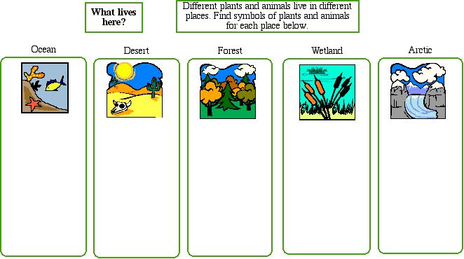 - Students will demonstrate knowledge of plants and animals within a habitat by dragging pictures into the appropriate habitat.